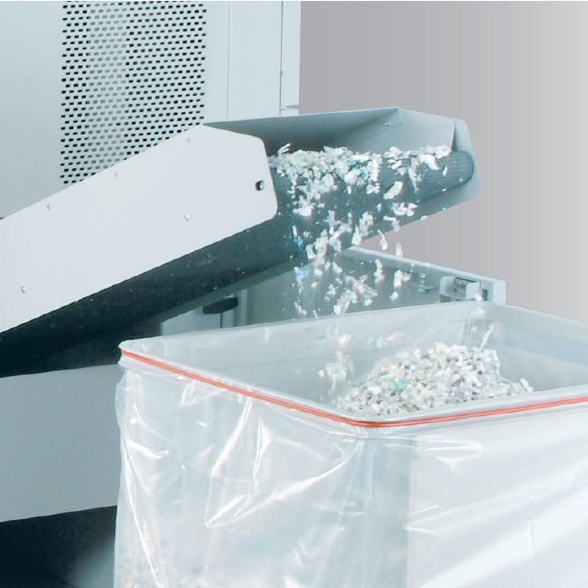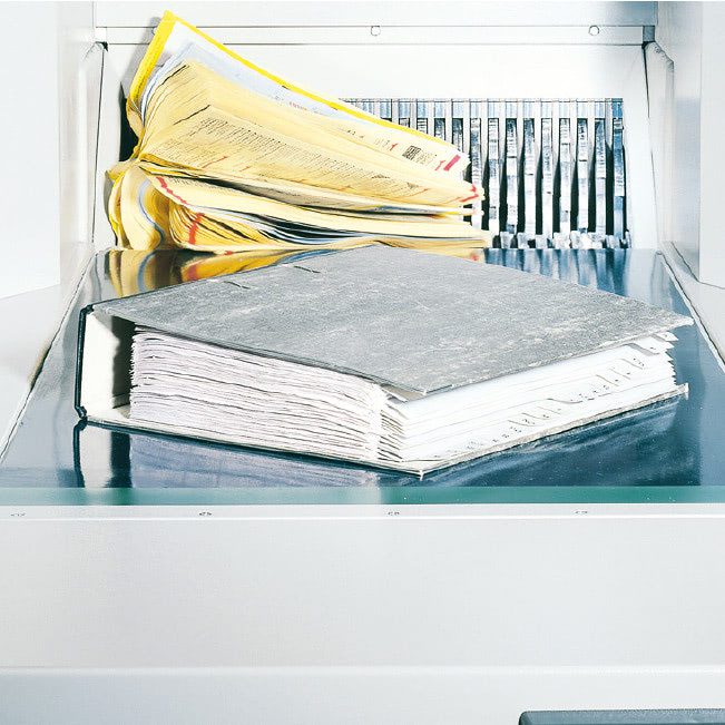 - Destructora de gran capacidad para volúmenes masivos de papel y archivadores enteros, incluyendo anillas metálicas.