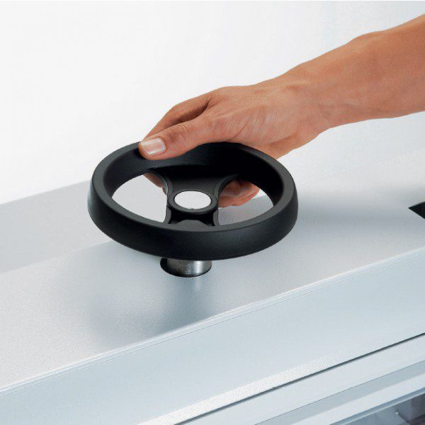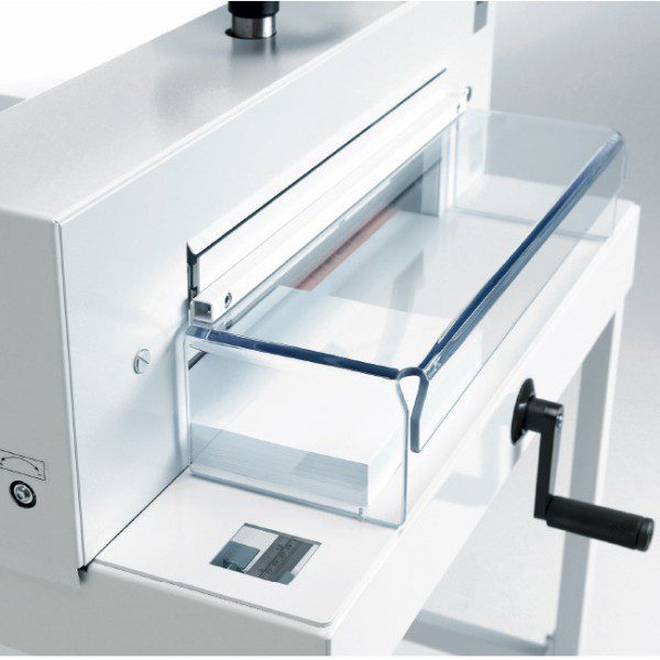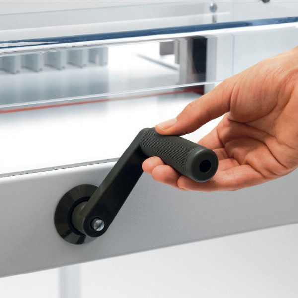Ofrece seguridad con su sistema Safety Cutting System y tapa oscilante en la mesa frontal. Con cuchilla reafilable, capacidad de corte de hasta 70 mm y una construcción robusta, permite ajustes fáciles y precisos para cortar materiales hasta tamaño DIN-A3.