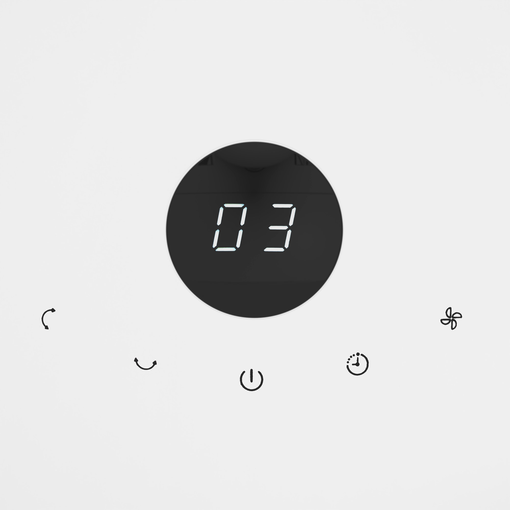 El manejo es sencillo e intuitivo, mediante botones táctiles o control remoto. Permite seleccionar entre cuatro niveles de velocidad, activar o detener la oscilación, y programar el temporizador con apagado o encendido diferido de hasta 9 horas.