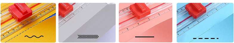 Esta cizalla cuenta con un juego de 4 cuchillas intercambiables que permite realizar cortes rectos, hendidos, perforados y ondulados. También incluye una regla extraíble para cortar piezas más grandes con precisión.